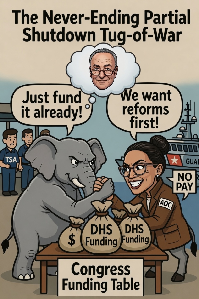 America at Risk. While America Wages War in open conflict with Iran—complete with U.S.-Israeli airstrikes on Iranian Regime targets, a naval blockade of the Strait of Hormuz, and escalating threats from Tehran’s regime—Senate Minority Leader Chuck Schumer is busy continuing a partial government shutdown that has crippled the Department of Homeland Security for over two months. This isn’t some abstract budget standoff. It’s a deliberate defunding for the very agencies tasked with protecting Americans, all so Schumer can extract leftist policy concessions on immigration enforcement.